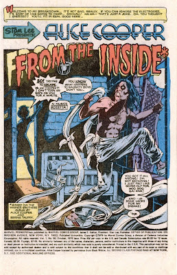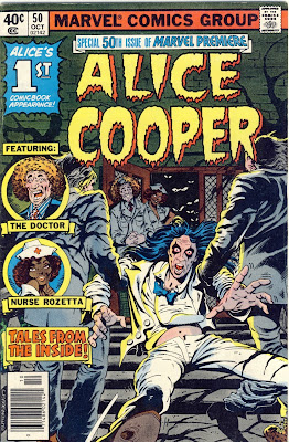 In contrast, Marvel Premiere's 50th issue: ‘Alice Cooper, Tales From the Inside’ (October 1979) is a decidedly humorous treatment of rock stardom, and a satire of Alice’s trademark theatrical gimmicks. The book is loosely based on Alice’s 1978 album of the same title, which was in turn derived from his experience in a sanitarium (which he had voluntarily entered in order to deal with his severe alcoholism; according to the Wiki entry, Alice was downing as much as two cases of Budweiser and a bottle of whiskey a day).