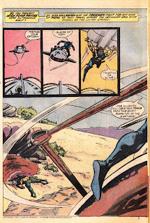 Things start somewhat promisingly, as we are treated to the sight of an escaping slave being executed in rather gruesome fashion by a tripod driven by a villainous individual named Skar. Killraven launches himself at the tripod canopy and a major battle with Skar looms….or so it seems (panels below).