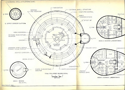 The blueprints were rather unexciting, even by fanboy standards. They consisted of 12 folded sheets depicting the Enterprise in various cross-sectional views, with noteworthy structural and engineering features pointed out for the delectation of the observer. Some of the decks and compartments were rarely, if at all, featured in the TV show but the author (Franz Joseph Schnaubelt, aka Franz Jospeh Designs) was given leeway to expand the description of the vessel as he saw fit.