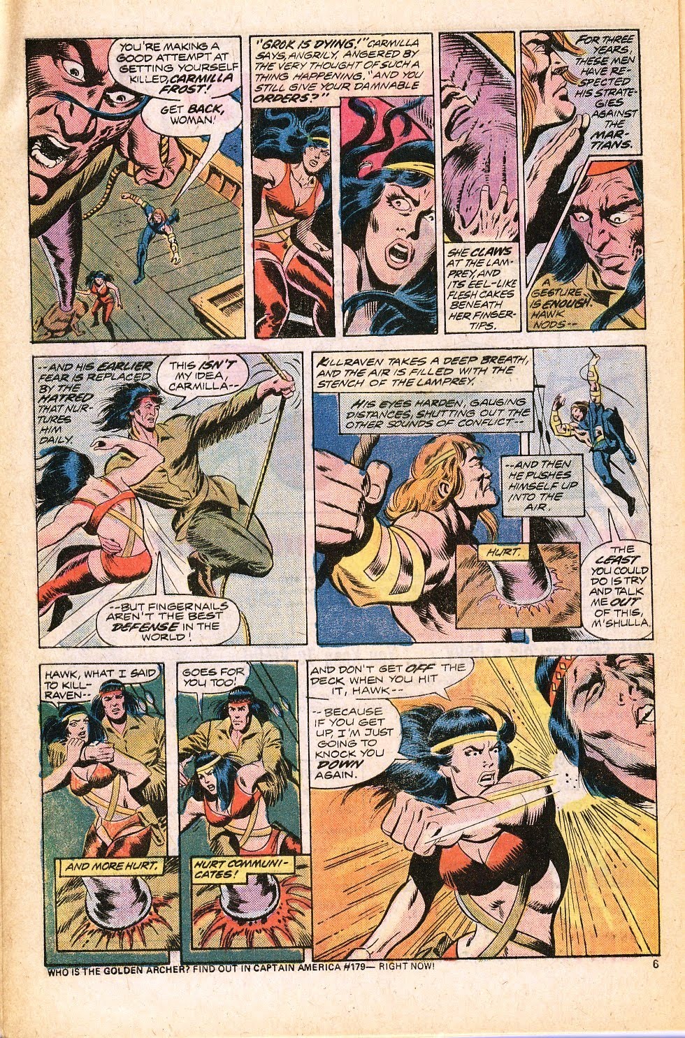 This issue introduces Volcana Ash, a woman with the attributes of Medusa and the Human Torch. She leads the rebels to Milwaukee, where the Martians have set up a colony of human slaves who are treated most heinously. It’s Killraven’s intent to free the wretched slaves, but the Martians have other plans…