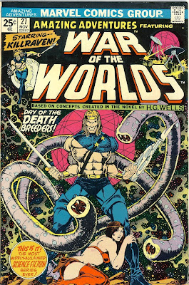 The cover for ‘Amazing Adventures’ No. 27 (November 1974) is uncredited but judging by the intricate style of the artwork and the ‘cosmic’ background, it’s probably Jim Starlin (and maybe the illustration was originally designed for an issue of ‘Captain Marvel’ or ‘Warlock’ ?).