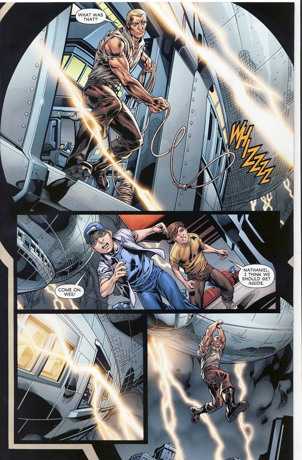 I’m unsure about this latest series for Doc Savage. The placement of Doc in the modern era seems a little unconvincing despite the studied use of the Art Deco motifs to the illustrations. While the effort to start things off from page one with a great deal of action is understandable from a point-of-sale marketing standpoint, the book doesn’t do much to try and orient the reader as to exactly who Doc and the Fabulous Five are, settling for some dialogue-mediated self-disclosures by Doc, even as he’s plummeting down an elevator shaft with two kids in his arms.