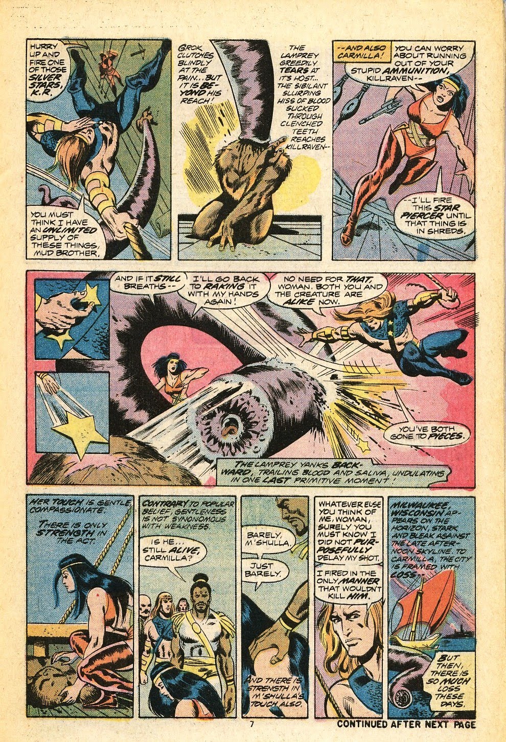 The book opens with Killraven and company iceboating on Lake Michigan, where they are attacked by giant lampreys (?!). This is less cheesy than it sounds; as the scan’s I’ve posted below indicate, it’s a harrowing battle that sees poor Grok the mutant nearly exsanguinated...