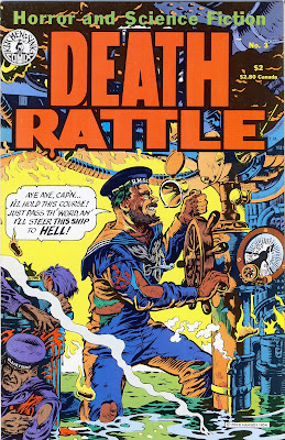 ‘Death Rattle’ first appeared in 1972 as an underground comix title from Kitchen Sink Press. Ultimately three volumes were published (each volume with its own issue No 1, issue No. 2, etc.) over the course of the 70s, 80s, and 90s. Issues from the first volume fetch high prices on the comix collectibles market.