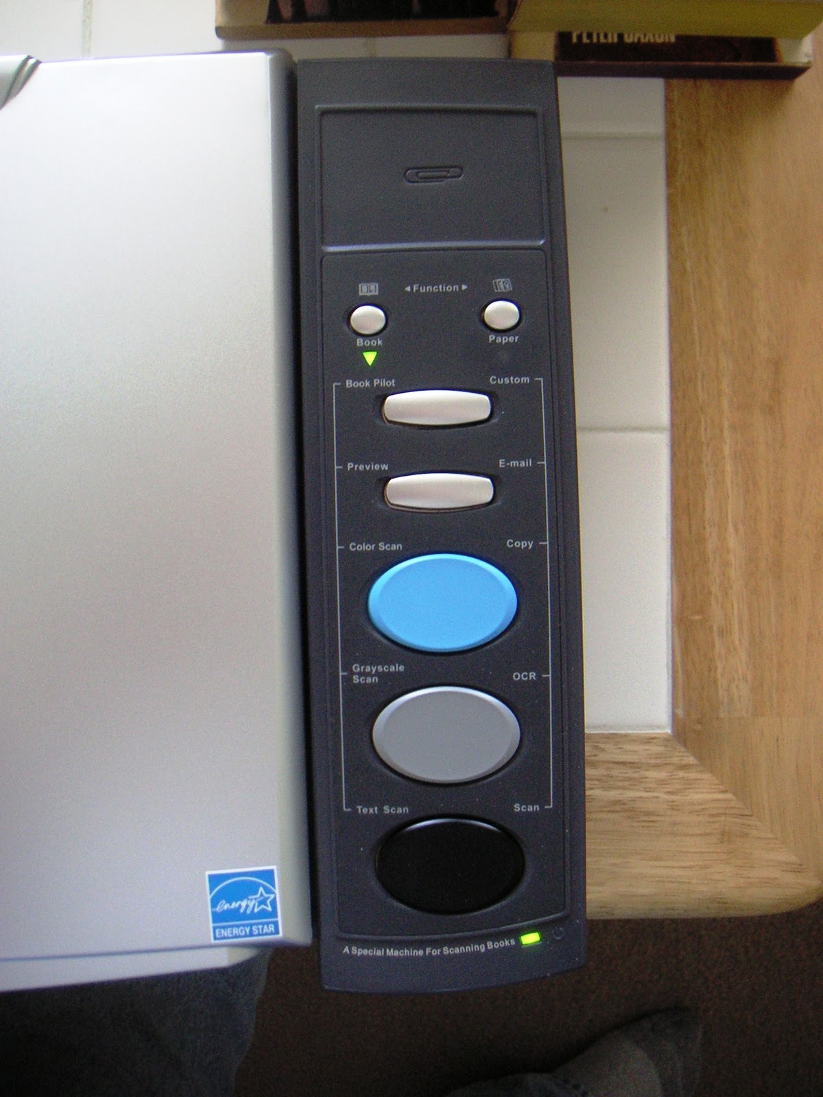 Scanning is relatively easy. You first select the 'Book' or 'Paper' buttons at the top corner of the scanner's button panel, then lay your book or document on the scanner, and then choose the larger buttons for either for 'color', 'grayscale', or 'text' scans:
