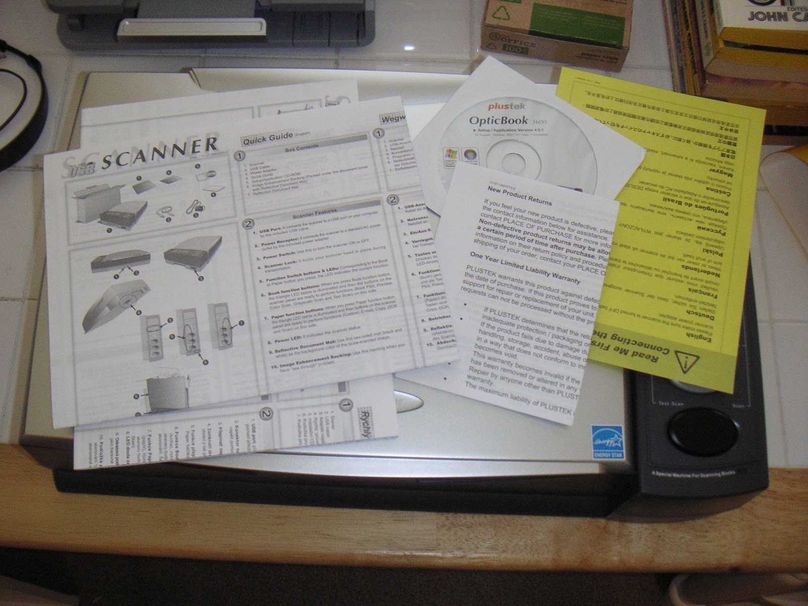 I've been testing out the plustek for the past two months. It comes with a modest quantity of printed manuals and guides, and a software CD that installs three programs related to scanning and image analysis: