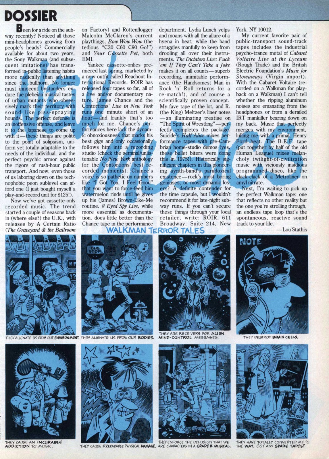 The ‘Dossier’ section provides some humorous insight into the tech toy of the day, the Sony Walkman. With iPods and smart phones so ubiquitous nowadays, it’s difficult to realize how revolutionary the Walkman was Back In The Day, when the idea of bringing your music with you had a hi-tech edge.