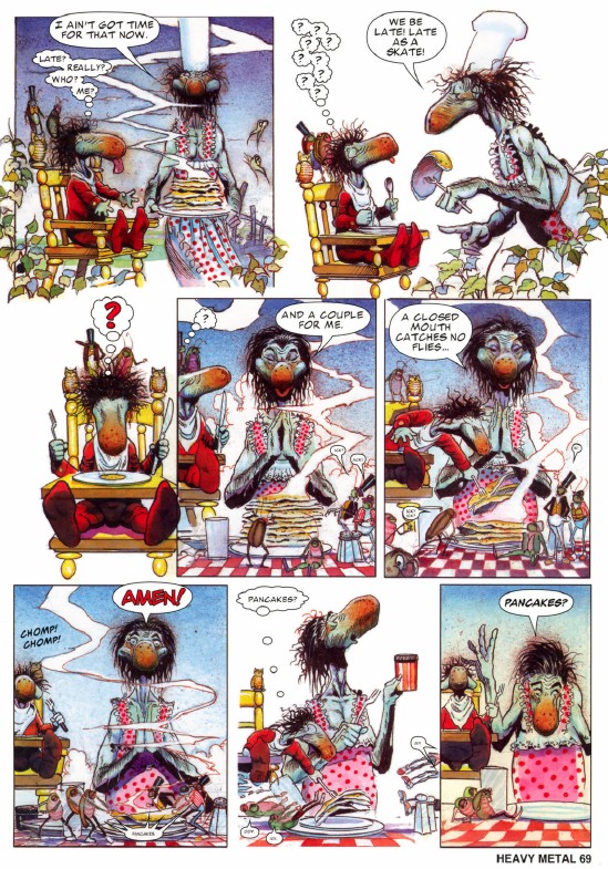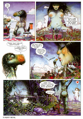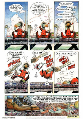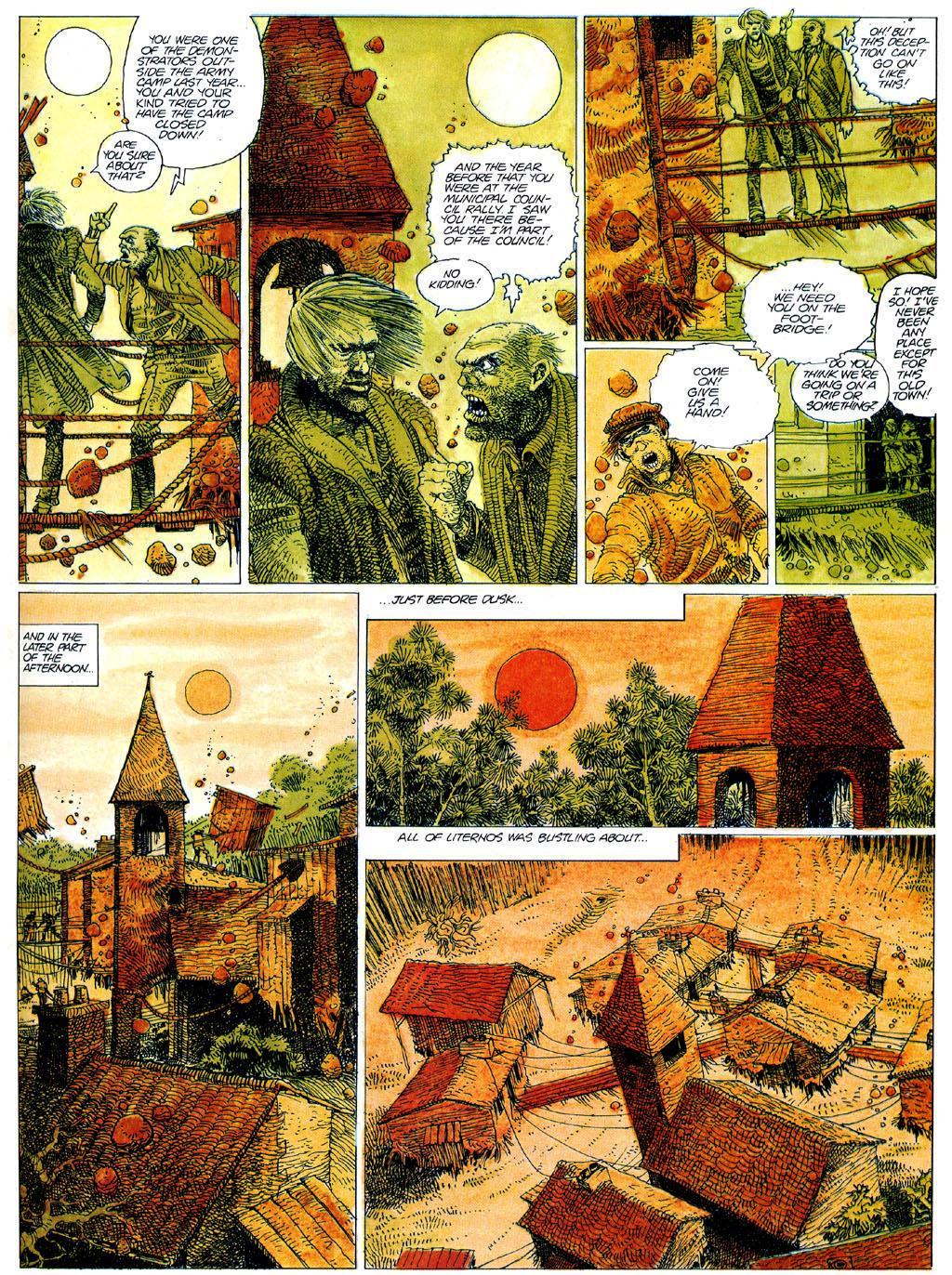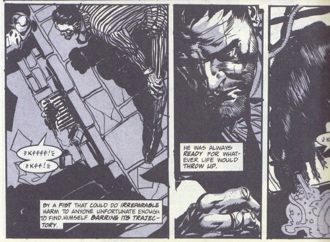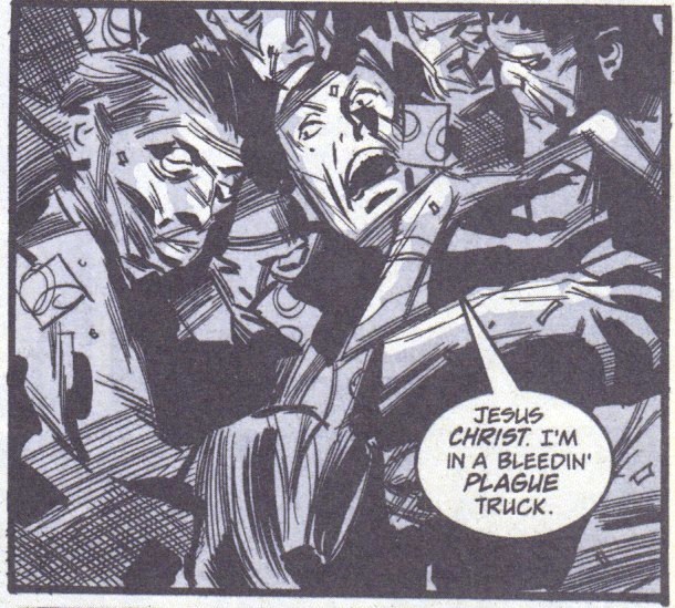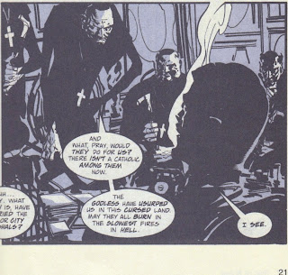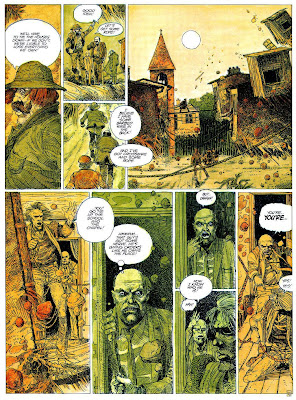 But the major drawback to the book is Watkiss's artwork. It's too loose, too half-finished, too murky. [A Spanish artist named Antonio Navarro was originally chosen to illustrate the series but withdrew when it became clear he couldn't meet the deadline]. I frequently found myself having to peer at a panel for an overlong amount of time in order to decipher Watkiss's poor draftsmanship.