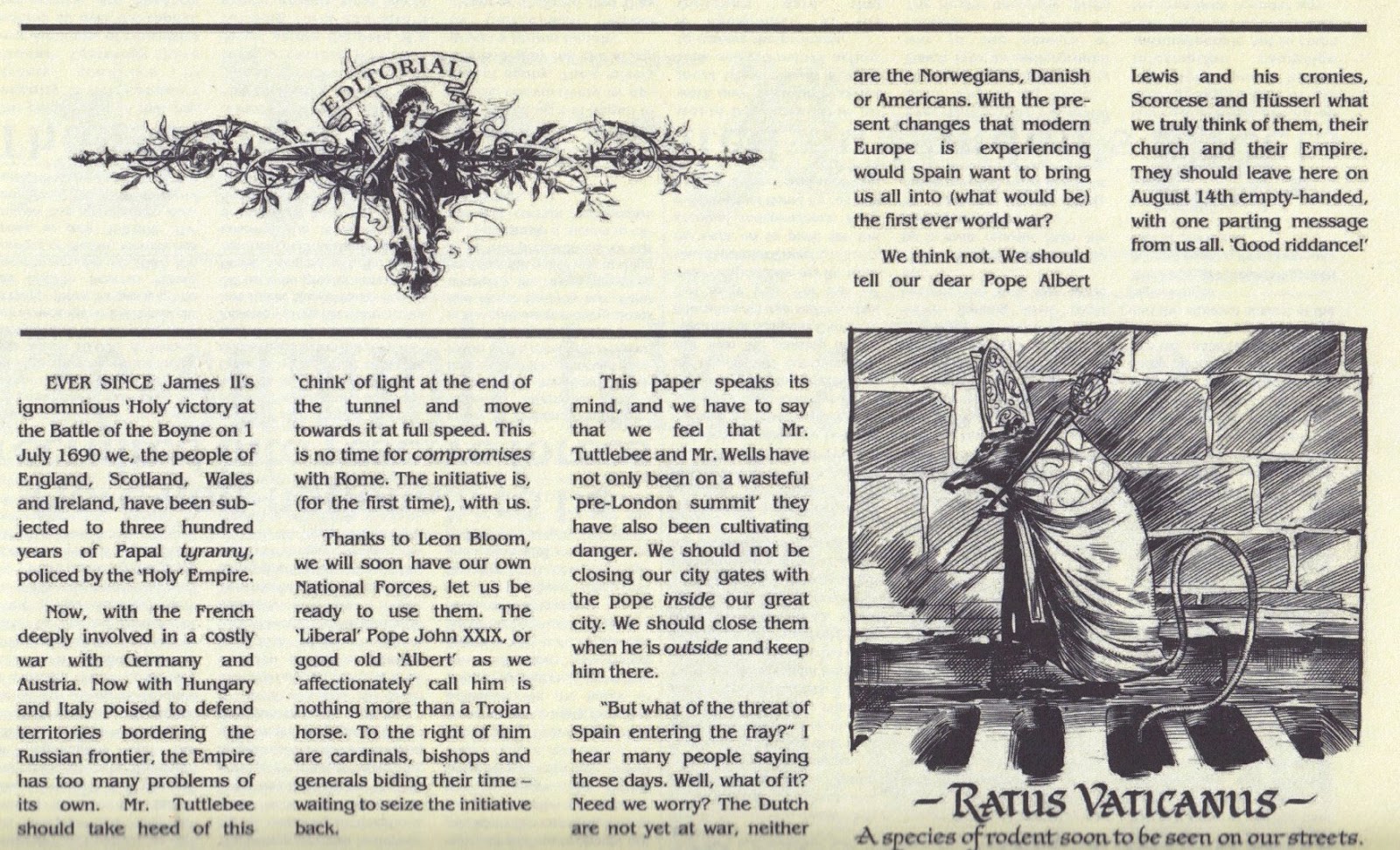 It's an uneasy world, however, with what could be the First World War underway on the Continent, and a British populace increasingly discontented with Papal rule. In an effort to retain British loyalties, Pope John XXIX is visiting London on a good-will tour.