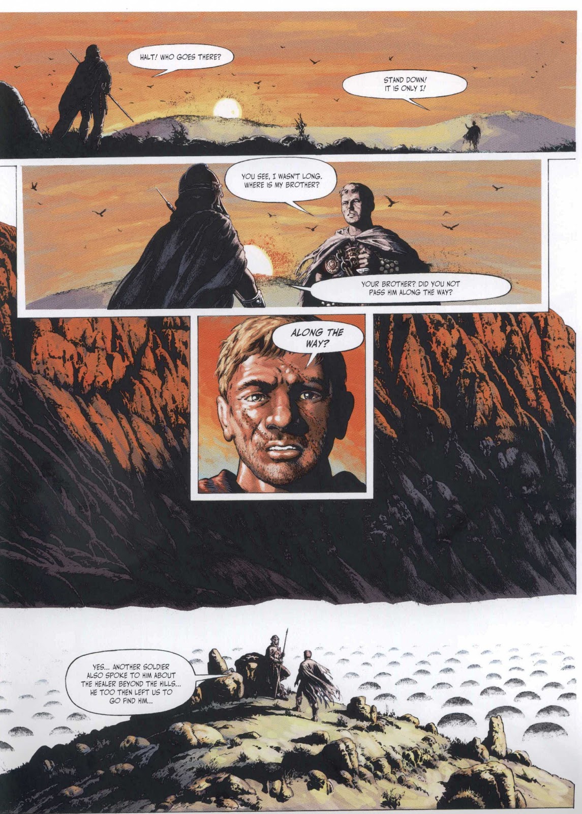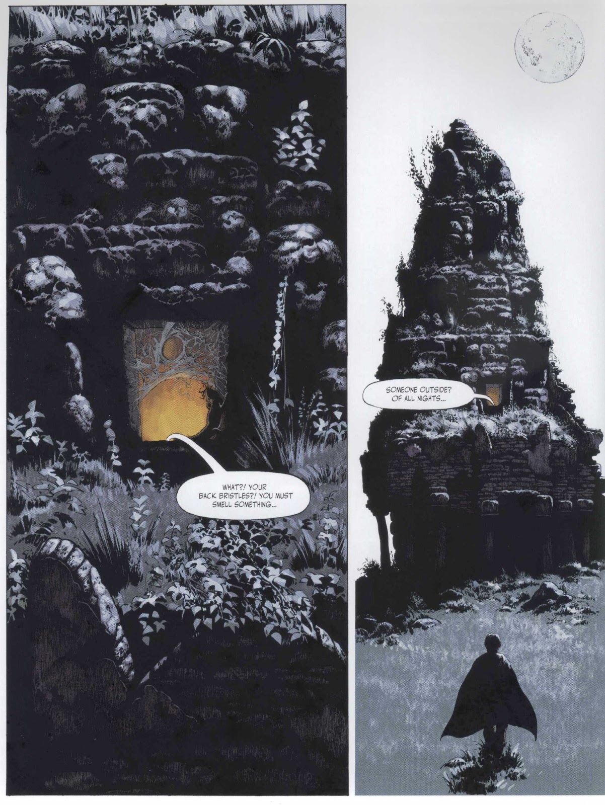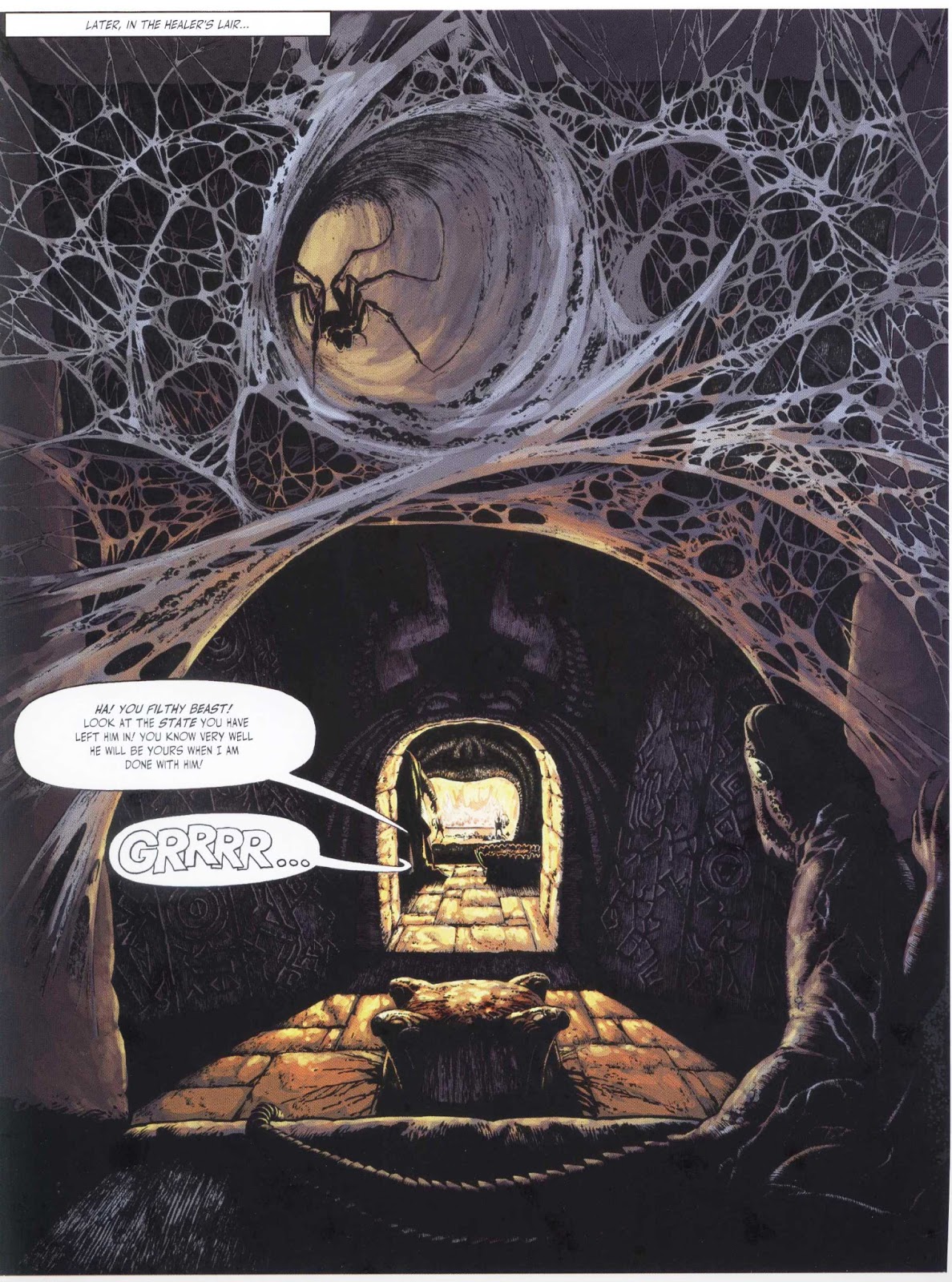 In his preface, Dionnet states that his artist partner worked very slowly, and looking at Gal’s draftsmanship, it’s understandable why this was so. Some of the panels in ‘Armies’ look like they took days of intricate penmanship to complete. Gal takes care to shade, stipple, and striate the bricks making up the exteriors and interiors of his Mayan temples; the folds of cloth making up the robes of his Tuareg – inspired desert tribesmen; the intagliated metal fashioning of the helmets and breastplates of his army troops; the wind-etched surfaces of the massive pinnacles of rocks that occupy his landscapes; and the spider webs from the 'wizard' episode posted below