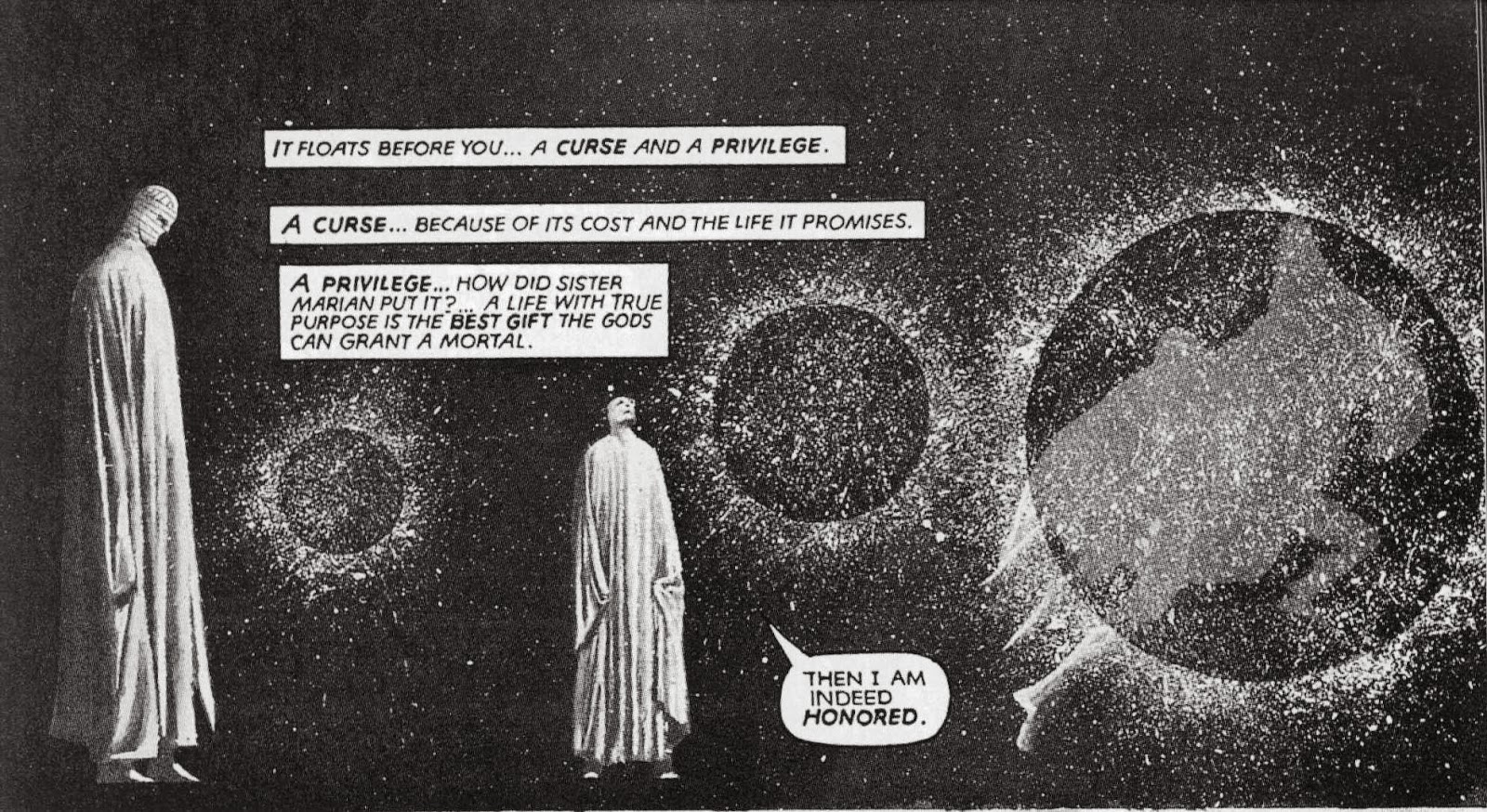 As well, Starlin’s use of painted artwork, involving a canny use of different shadings of grays and whites for the black-and-white episodes, stands apart from contemporary comics and their flat, computer-assisted approach to illustration.