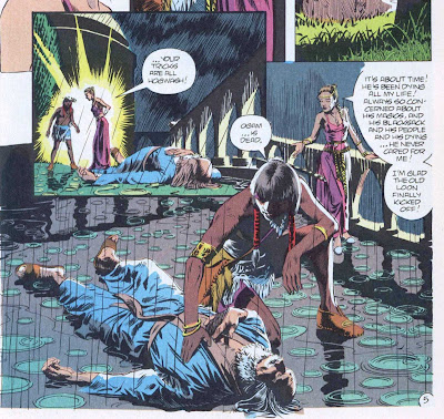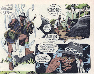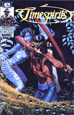 The colors, primarily done by Steve Oliff, are serviceable, no mean feat since it was likely that Timespirits was printed - like many other 80s comics - on a flexographic press. The flaws of this process are too noticeable to be overlooked - Doot and Cusack frequently have dark gray skintones - but it's not Oliff's fault.