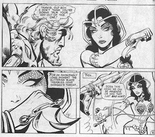 The latter issues in this compilation indicate that, with the title's financial success, Grell was given greater leeway in terms of content; as well, the advent of frequent barbarian / sword and sorcery stories in 'adult' comics like Heavy Metal and the Warren magazines, in the late 70s, seems to have further loosened the editorial restrictions imposed on The Warlord.