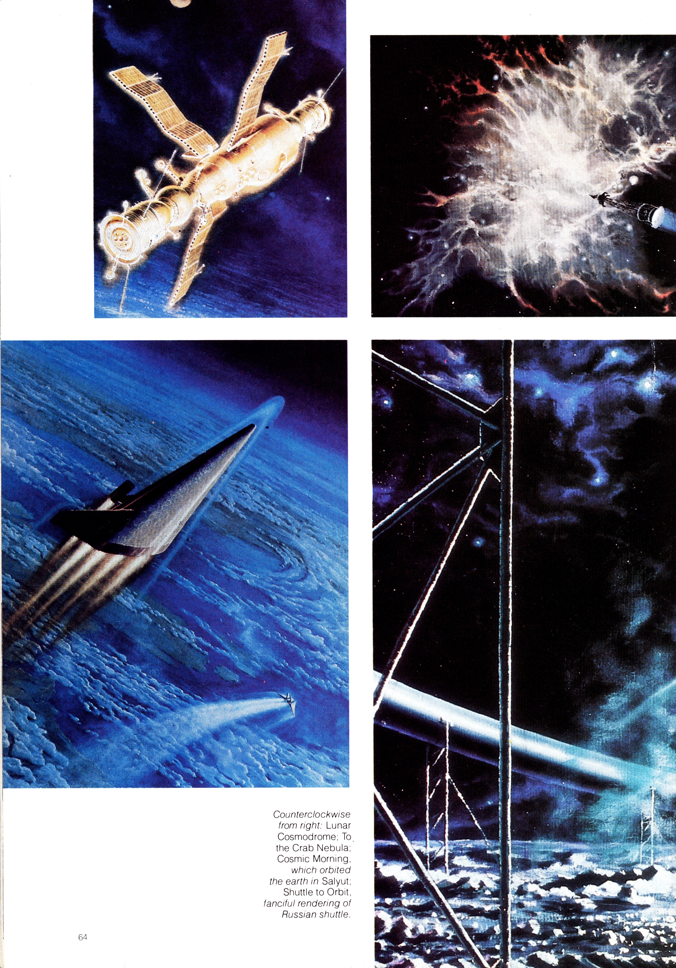 Interspersed with the stories are pictorial essays, several of which are excerpts from the illustrated novels produced by Harry Harrison in the late 1970s: Mechanismo and Planet Story. Another portfolio came from the art book Immortals of Science Fiction (1980).